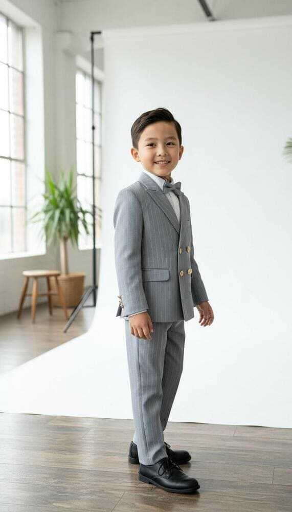 Full Set Beystil Sivri Yaka Gri Çizgili Çocuk Kruvaze Elbise