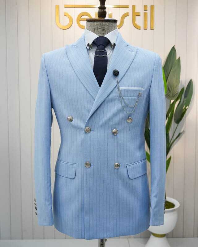 Beystil sivri yaka bebe mavisi çizgili kruvaze takım elbise, şıklığı ve konforu bir arada sunan bir tasarıma sahiptir. Slim fit kalıbı, modern görünümünüzü tamamlar ve her ortamda dikkat çekmenizi sağlar. Gardırobunuzda bu zarif takım için yer açın ve stilinizi bir üst seviyeye taşıyın!