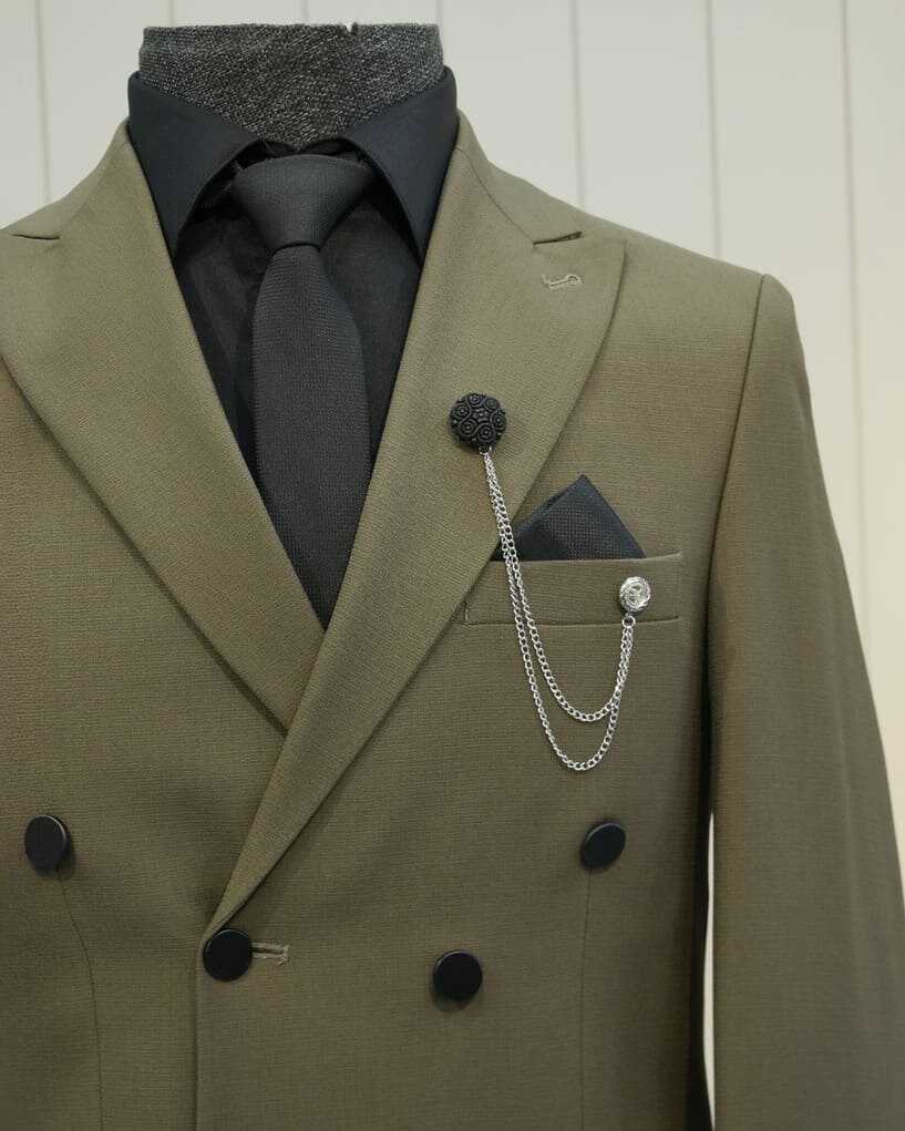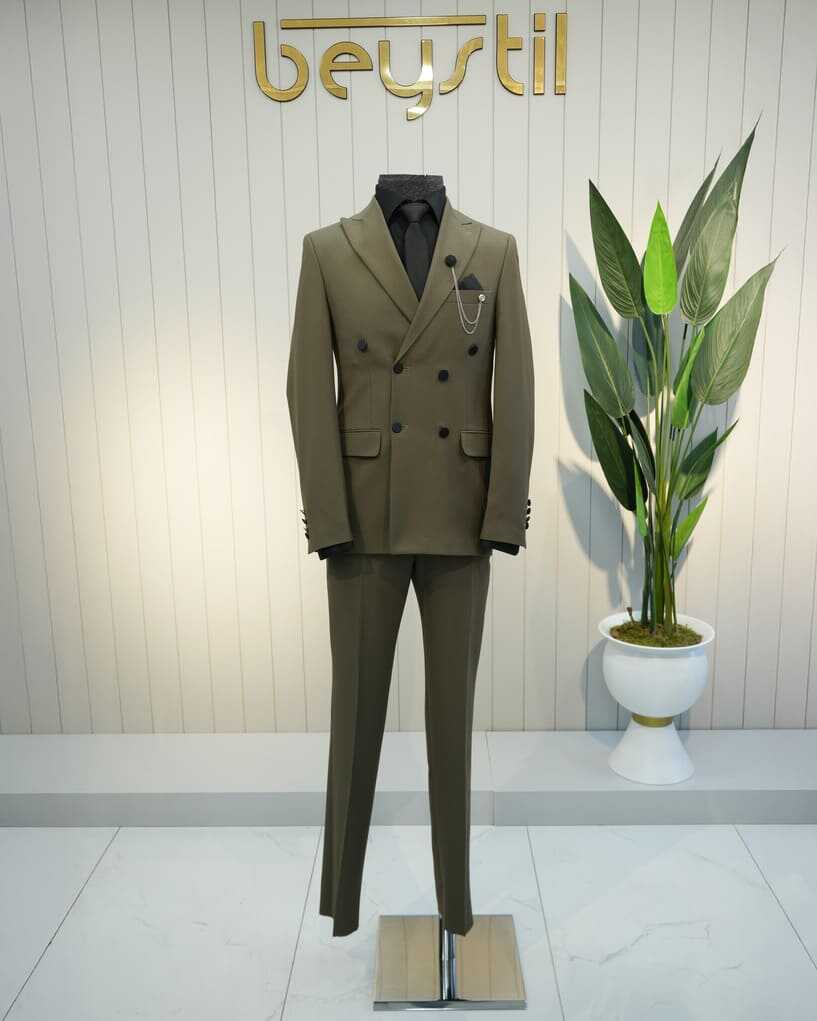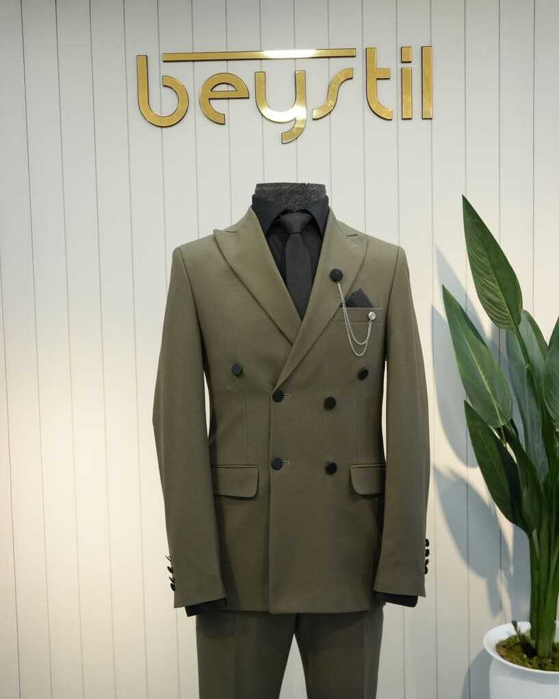Beystil sivri yaka haki kruvaze takım elbise, şıklığı ve konforu bir arada sunan bir tasarıma sahiptir. Slim fit kalıbı, modern görünümünüzü tamamlar ve her ortamda dikkat çekmenizi sağlar. Gardırobunuzda bu zarif takım için yer açın ve stilinizi bir üst seviyeye taşıyın!