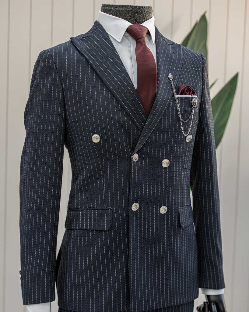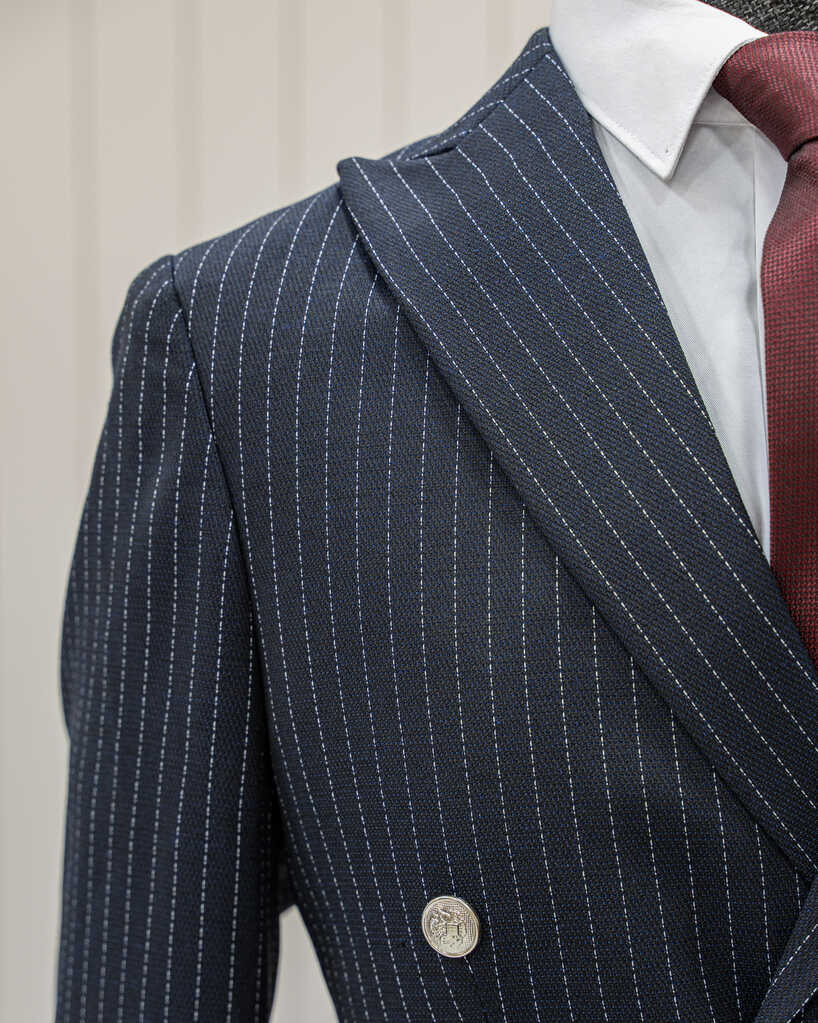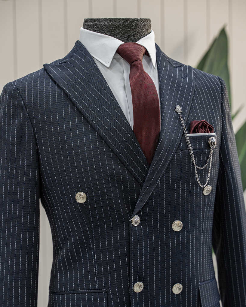 Beystil sivri yaka lacivert çizgili kruvaze takım elbise, şıklığı ve konforu bir arada sunan bir tasarıma sahiptir. Slim fit kalıbı, modern görünümünüzü tamamlar ve her ortamda dikkat çekmenizi sağlar. Gardırobunuzda bu zarif takım için yer açın ve stilinizi bir üst seviyeye taşıyın!