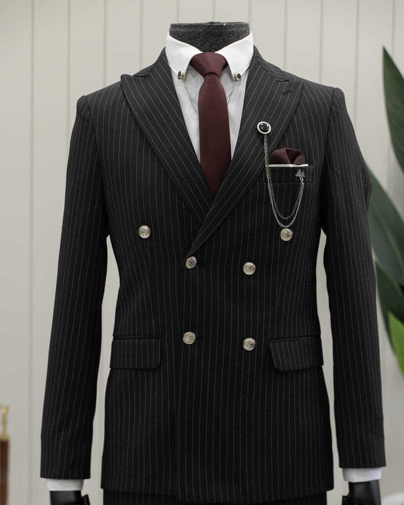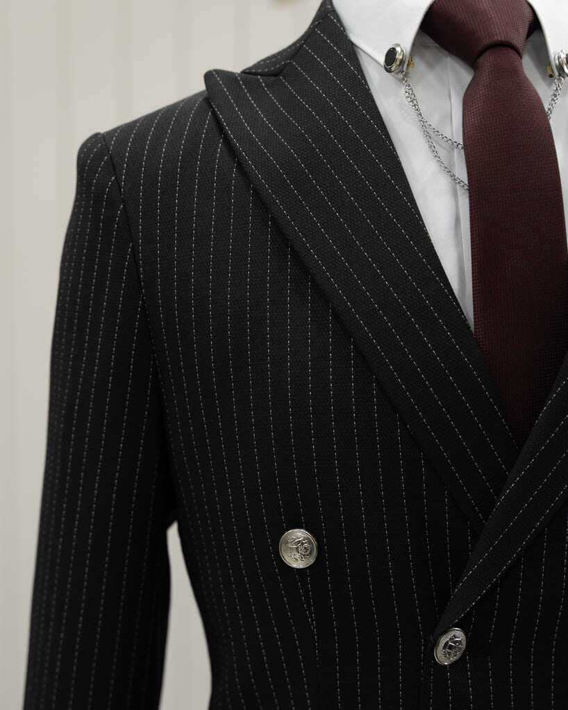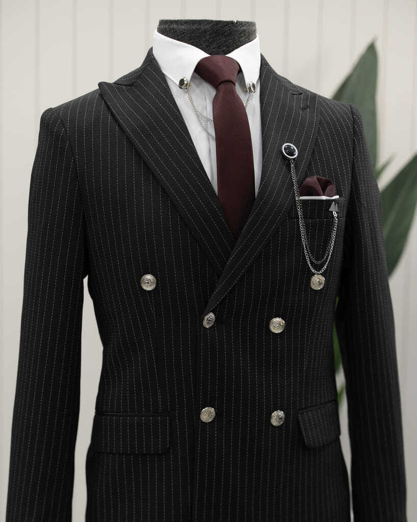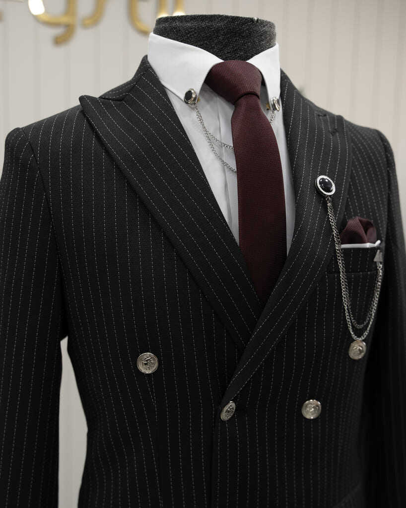 Beystil sivri yaka siyah çizgili kruvaze takım elbise, şıklığı ve konforu bir arada sunan bir tasarıma sahiptir. Slim fit kalıbı, modern görünümünüzü tamamlar ve her ortamda dikkat çekmenizi sağlar. Gardırobunuzda bu zarif takım için yer açın ve stilinizi bir üst seviyeye taşıyın!