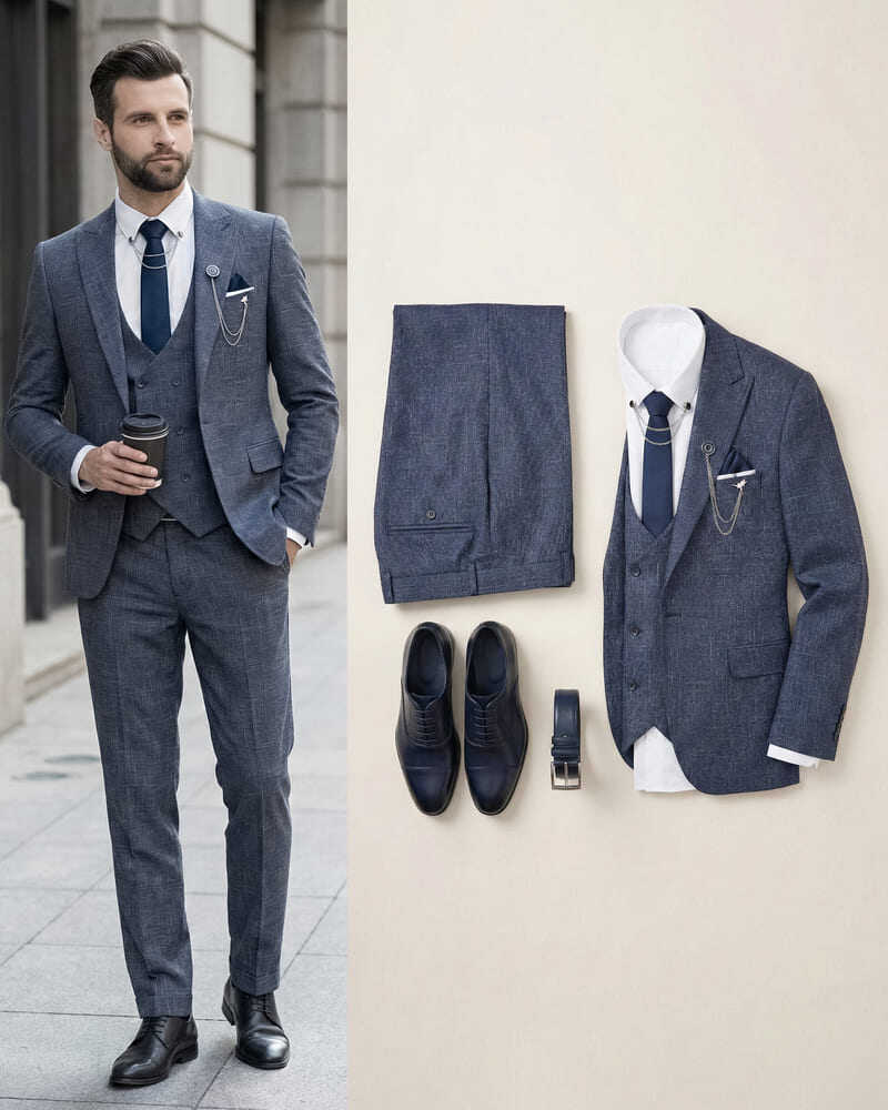 👉Ceket +Yelek + Pantolon + Gömlek + Kravat +mendil + Yaka Zinciri: 3.500₺✨