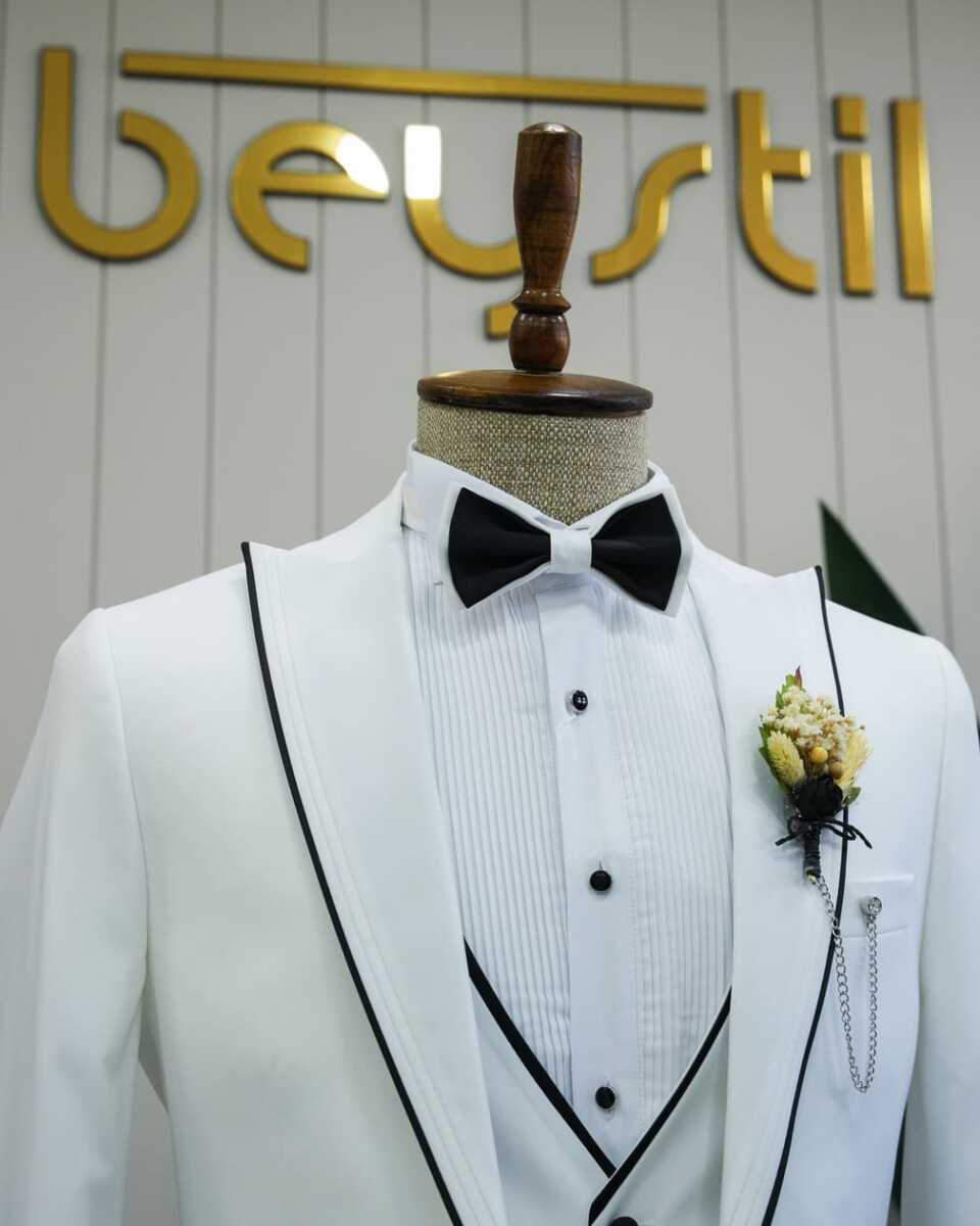 Gelince Haber VerBeystil’in beyaz slim fit damatlık & smokin takımı, modern tasarımı ve esnek kumaşıyla özel günlerinizde şıklığınızı ön plana çıkarır. %70 polyester ve %30 viskon içeriğiyle likralı, esnek bir yapıya sahiptir. Çift yırtmaçlı ve tek düğmeli tasarımı, sivri yaka detayıyla klasik ve modern çizgileri bir araya getirir. Yelekli ve kuşaklı şekilde kullanıma uygun olan bu takım, seyyar çıkarılabilir yaka özelliği sayesinde düğün sonrasında günlük hayatta ve özel günlerde de rahatlıkla kullanılabilir. Ata yaka gömleği, papyon formunun daha estetik bir duruş sergilemesini sağlar.