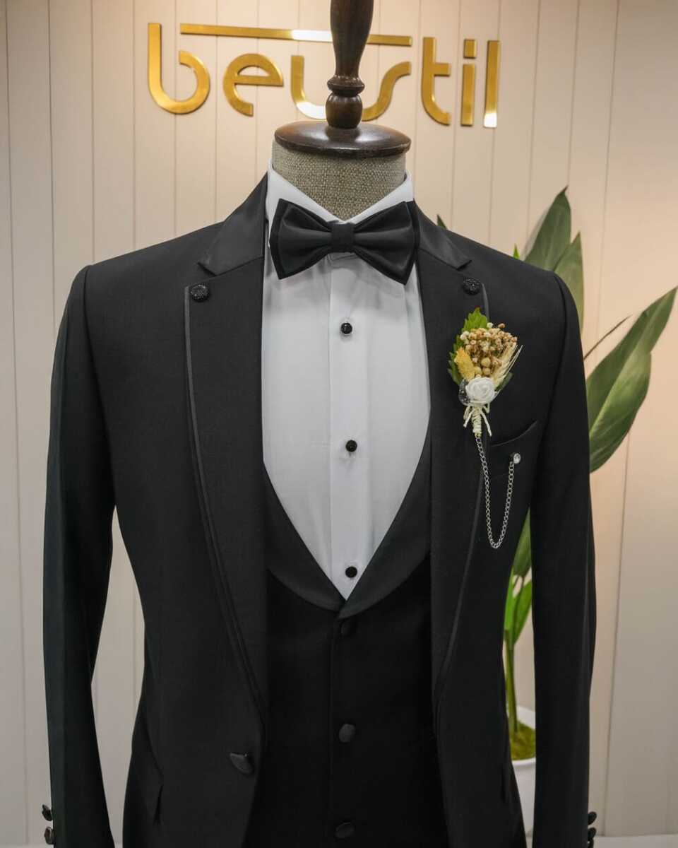Beystil sivri yaka siyah damatlık & smokin takımı, şıklığı ve konforu bir arada sunan bir tasarıma sahiptir. Slim fit kalıbı, modern görünümünüzü tamamlar ve her ortamda dikkat çekmenizi sağlar. Gardırobunuzda bu zarif takım için yer açın ve stilinizi bir üst seviyeye taşıyın!